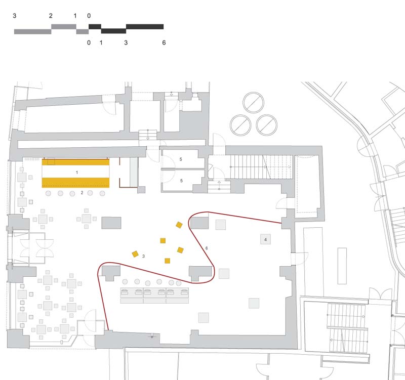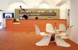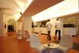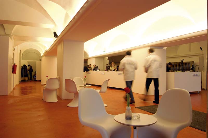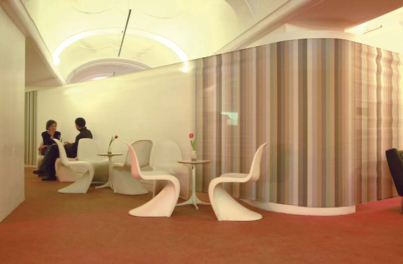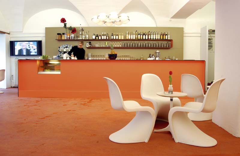 Palais Thienfeld, Graz, 2003 Caf�, Bar, Lounge, Presseinformation, Graz 2003 - Kulturhauptstadt Europas Mariahilfer Stra�e 2, 8020 Graz Im Rahmen von Graz 2003 - Kulturhauptstadt Europas werden die im Erdgeschoss gelegenen R�umlichkeiten des Stadtpalais kurzfristig f�r den Tagesbetrieb als Caf� und Pressezentrum adaptiert. Die Raumkonzeption besteht aus einem Barelement in Max Compactforming in den Farbt�nen Orange und Tabak. Im Kontrast zu orangem Boden und Bar setzen die strahlend wei�en Oberfl�chen der Deckenkuppeln mit der ebenso wei�en M�blierung ein sichtbares Zeichen. Durch die in der Helligkeit anpassbare Beleuchtung k�nnen tageszeitspezifische Situationen geschaffen werden. Um den Raum f�r unterschiedliche Nutzungen zu strukturieren besteht die M�glichkeit einen gespannten Raumteiler aus bedrucktem Netzgewebe zu positionieren. Die Leuchten wurden von Hans Gamperl zur Verf�gung gestellt. Bauherr: Graz 2003 - Kulturhauptstadt Europas GmbH Projektleitung: Siegfried Frank, Michael Rieper Mitarbeiter: Christine Schmauszer, Georg Skerbisch Foto: Michael Rieper Planungs- und Bauzeit: 11/2002 - 01/2003 Fl�che: 230 m� Nettoherstellungskosten: EUR 30.000,-