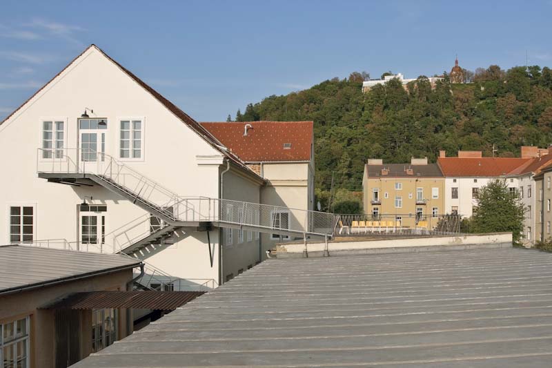 Raumfolge. Treppe. Erschlossen wird das LendLoft über eine außen liegende Stahltreppe an der Westseite des Gebäudes. Dabei wird ein alter Übergang der ehemaligen Produktionslinien der Schafwollwarenfabrik durchquert. Diese Übergänge zwischen den Gebäuden sind für das Areal charakterbildend. Unterstützt wird diese Formensprache noch durch die emaillierten Blechleuchten, die sich im Winde wiegen. Studio. Angekommen im sogenannten „Studio“ breitet sich ein Raum mit 276 m² aus, der nur durch das original erhaltene Dachtragwerk strukturiert wird. Die alten Stuhlsäulen und Gespärre wurden gereinigt und in ihrer ursprünglichen Form erhalten. Die Raumstruktur des Dachtragwerkes bildet Zonen wie Garderobe, Büro, Küche, Freiraum zum Entspannen, drei Nischen die Zimmer sein könnten und im Mittelbereich Platz für eine große Tafel. Zwischen den Stützen befinden sich seitlich drei weiße, saubere Kuben – die WCs und Bäder; innen wie außen gänzlich weiß, nur der alte Bretterboden des Dachbodens läuft hindurch. Loft. Die Freitreppe hinaufgekommen, je nach Veranstaltung im Studio umgekleidet, geht es durch das alte renovierte Stiegenhaus in das 2. Obergeschoss hinunter. Raumelemente wie 5 alte Eisensäulen, 18 handgefertigte Kastenfenster in weiß, abgehängte Industrieleuchten, Parkettboden, Tageslicht und die Baumkronen des Gartens bestimmen den Raum. Der in das alte Stiegenhaus gehängte Lagerraum macht es möglich das Loft gänzlich freizuhalten. Die in die Decke integrierte Beleuchtung ermöglicht es verschiedenste Stimmungen im Raum zu inszenieren. Sonnendeck. In der Pause oder bei schönem Wetter geht es über die Freitreppe und einen schmalen Steg auf das Flachdach des Nebengebäudes. Darauf befindet sich das sogenannte Sonnendeck. Ein Freiraum inmitten der Stadt zwischen Schloßberg und Lendplatz. Ein Traum ist wahr geworden. Ein schönes Projekt. Danke Ferdinand.