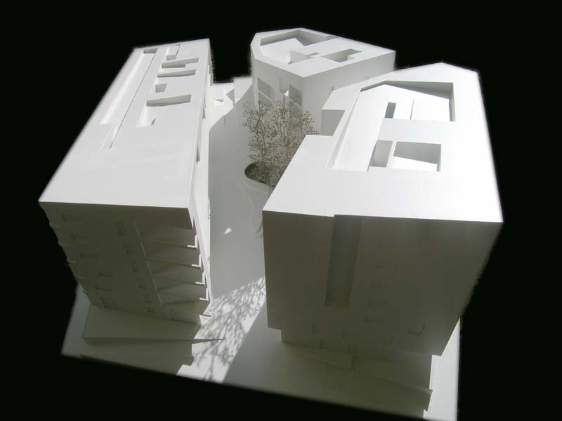 Vertikale Schichtungen - Wohnen in der Kaiserau, Bozen S�dtirol, 2004 Wettbewerbsprojekt (anonymer, einstufiger Realisierungswettbewerb) Basisparameter. Die Entstehung des Projektes entstammt einem Masterplan, der das Volumen der Bauk�rper und ihr Beziehungen zueinander pr�zise festlegt. Diese Pr�misse wird stringent weiterverfolgt und f�hrt zu einem Gesamtkonzept, das den Freiraum vom Erdgeschoss �ber Loggias auf die Dachfl�chen der Bauk�rper erweitert bzw. jeder Typologie ihren spezifischen Zugang ins Freie erm�glicht. Es entstehen bewohnbare Schichtungen , die in Abh�ngigkeit von dem zu erreichenden Volumen bestimmt werden. Unter Ber�cksichtigung der Ost-West ausgerichteten Typologien werden optimale Belichtungssituationen erzielt und zugleich ein H�chstma� an Flexibilit�t und �konomie gew�hrleistet. Maximalvolumen - pers�nlichem Freiraum - Kommunikation/Erschlie�ung = Kontur. Als Kontur werden in diesem Zusammenhang sowohl Grundriss, Schnitt als auch Ansicht betrachtet, die jeweils die maximalen Rahmenbedingungen funktional ausloten und festschreiben. Die Erschlie�ungst�rme gliedern die dichten Packungen der Objekte A, B und C in jeweils zwei Teile. Typologien. Der hohe Ausarbeitungsgrad gew�hrleistet im Detail die qualitativ hochwertige Unterbringung von 92 flexiblen Wohneinheiten , wobei s�mtliche Typen von zwei Seiten belichtet und bel�ftet sind. Es handelt sich dabei um "durchgesteckte" Wohnungen , die zur G�nze �ber raumhohe Fenster�ffnungen verf�gen. Dies trifft auch auf die Maisonetten zu. In Objekt A und B schaffen Lichth�fe eine nat�rliche Bel�ftung und Belichtung der innenliegenden Nasszellen. Individuelle Kombinationen aus den Funktionen "Wohnen" und "K�che" gestatten den Nutzern pers�nliche Raumbed�rfnisse einfach umzusetzen. Die K�che ist in jeder dieser Typologien als Eigenraum ausf�hrbar.