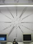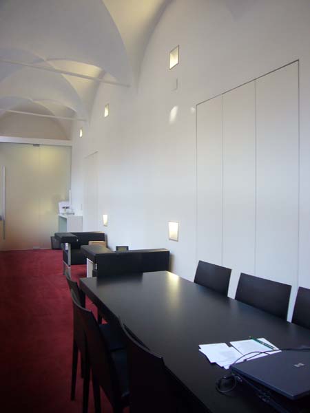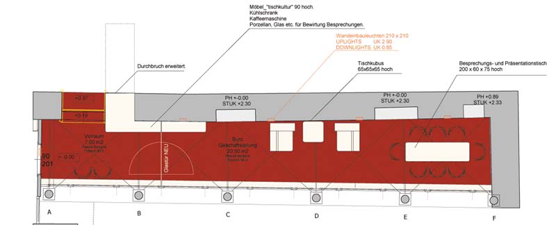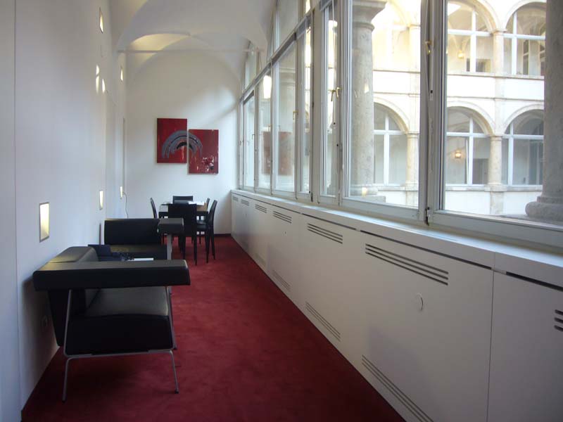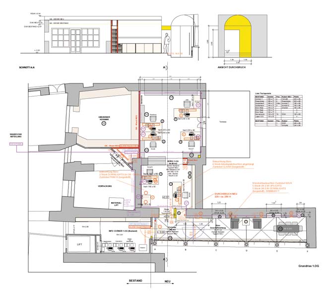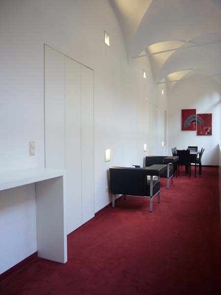 Aus einem Teilbereich der Verkaufsräume und einer Restfläche des Lagers vormals eines Ganges des historischen Innenhofes – sogenannten Generalihofes – entsteht durch eine Durchbrucherweiterung eine neue Raumsituation . Ein kleines feines Großraumbüro mit bester Akustik und Ausstrahlung für die Verwaltung des Unternehmens. Das Büro der Geschäftsleitung befindet sich im historischen Teil mit Kreuzrippengewölbe und erstaunlichen zwei Metern Breite.