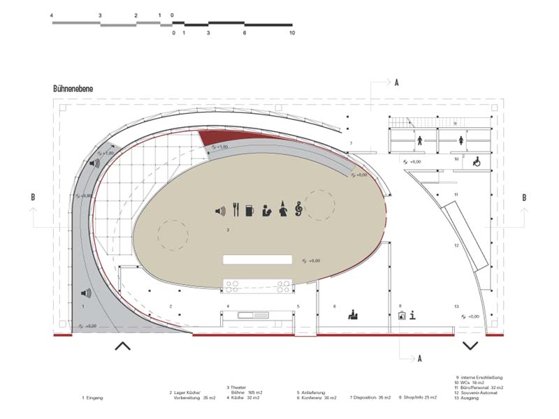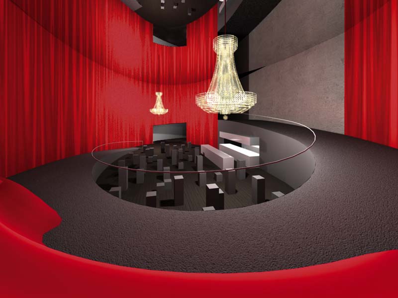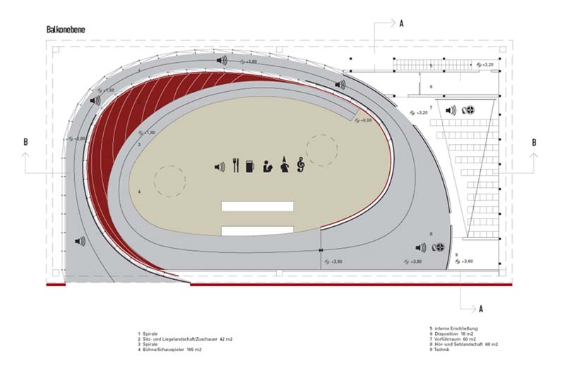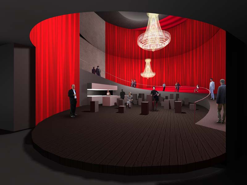 Das Theater als szenische Plattform österreichischer Kultur , repräsentiert durch die akustische Annäherung entlang einer Spirale , die im Zenit den Blick auf die Bühne öffnet. Dort findet sich als augenblickliches Spiel ein Gasthaus mit Schauküche als Vermittler österreichischer Kulturformen, ergänzt durch ein kulturelles Rahmenprogramm. Der Besucher wechselt vom Zuschauer zum Schauspieler im Gasthaus und erfährt charakteristische Lebensweise. En passant vermittelt eine Hör- und Sehlandschaft markante Bilder.