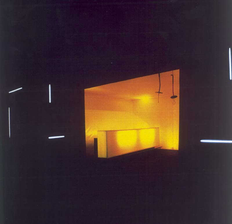 Herbstbar, Graz, 1996 Forum Stadtpark, 8010 Graz Es bestand der Wunsch, den kulturellen Veranstaltungen, die bisher in den notd�rftig adaptierten Kellerr�umen Platz gefunden haben, einen ad�quaten Rahmen zu geben. Die Nutzungen sind neben Theater auch Film, Musik und Lesungen. Die Aufgabe lag darin, sowohl einen multifunktionalen Raum mit gesondertem Barbereich zu schaffen, als auch beide R�ume als Bar nutzbar zu machen. Es werden zwei Zust�nde maximaler Gegens�tzlichkeit inszeniert, indem die spezifischen Anforderungen bez�glich Beleuchtung und Akustik sinnlich artikuliert werden. Die unterschiedliche Behandlung von Licht und Oberfl�che schafft zwei polare Raumzonen mit verschiedenen Aggregatzust�nden: eine leere Zone, durchschnitten von aggressivem Licht, eine ges�ttigte Zone, durchstr�mt von weichem Licht. Die haptische Qualit�t der jeweiligen Oberfl�che kontrastiert die von ihnen eingeh�llte Zone und verwischt in ihrer Beschaffenheit eine eindeutige Begrenzung: unsichtbares Schwarz, flauschig-weich in der leeren Zone, elastisches Gelborange, k�hl-glatt in der ges�ttigten Zone. Bauherr: Forum Stadtpark Graz Projektleitung: Bernd Vlay, Paul Vabitsch, Siegfried Frank Mitarbeiter: Gerhard Bachlechner Planungs- und Errichtungszeit: 05/1996 - 09/1996 Nettonutzfl�che: 100 m� Fassungsverm�gen: 70 Personen