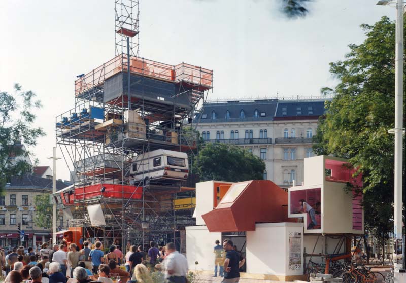 Sechs Wochen lang wurde der Wiener Wallensteinplatz zu einer vertikalen Spielwiese für Interessierte, PassantInnen und BewohnerInnen der Umgebung. "add on. 20 höhenmeter", ein öffentlich begehbares, bis zu zwanzig Meter hohes Kunstwerk, das als Environment zum Erkunden neuer Welten einlädt und auf verschiedenen Ebenen vielfältige Durch- sowie Ausblicke ermöglicht. Die Skulptur als benutzbares Objekt, das mit seinem Publikum kommuniziert und interagiert. Im täglichen Programm präsentierten internationale KünstlerInnen Positionen der grenzüberschreitenden Kunst- und Kulturproduktion.