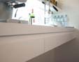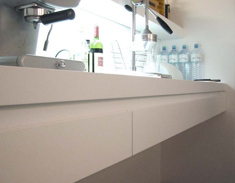 K�chenm�bel Wohnung Z., Graz, 2002 Ein in wei�em Schleiflack beschichtetes K�chenm�bel schafft mittels der dahinter liegenden Spiegelfl�che eine imagin�re Erweiterung . Bauherr: privat Projektleitung: Siegfried Frank Planungs- und Bauzeit: 2002